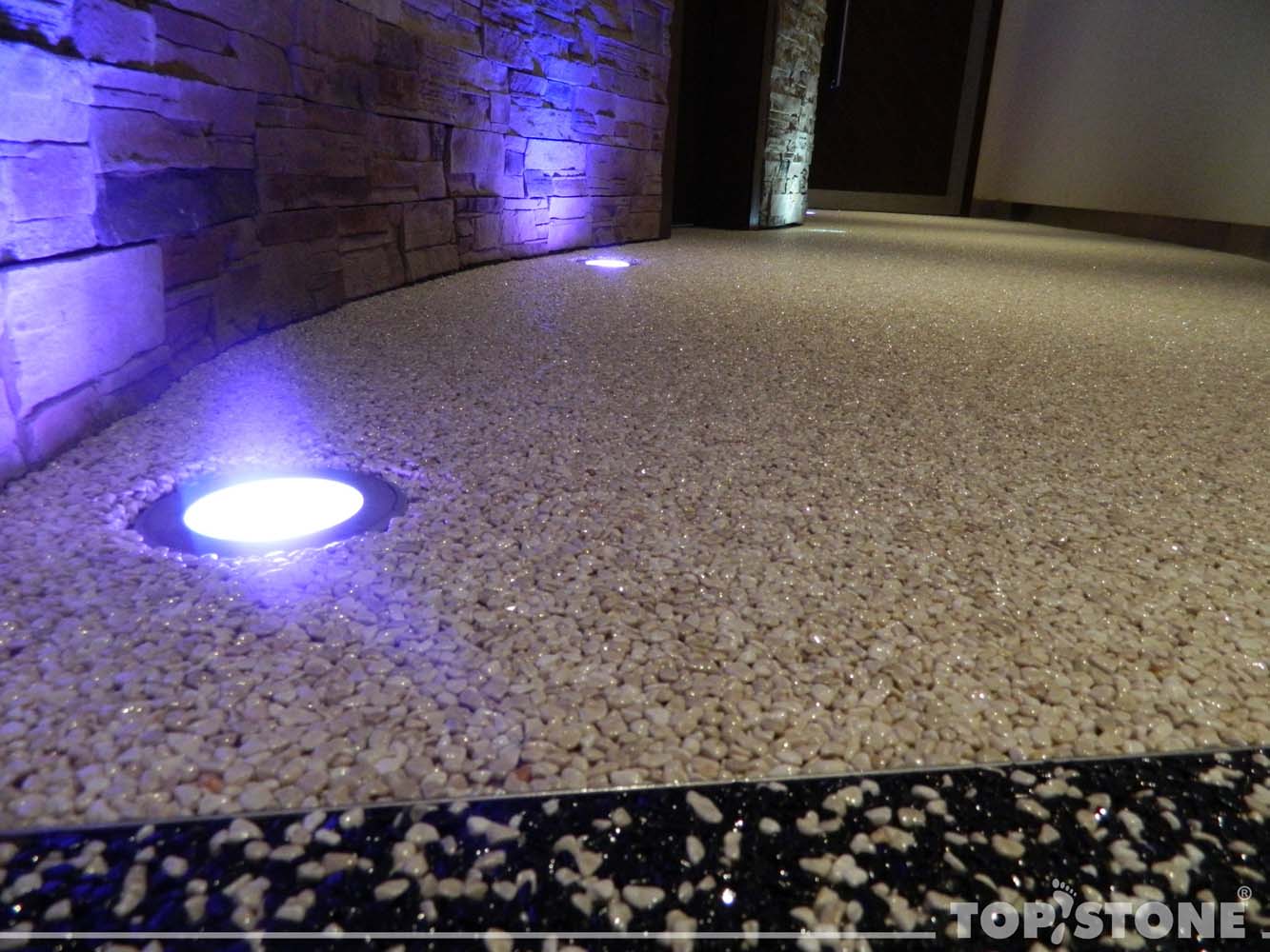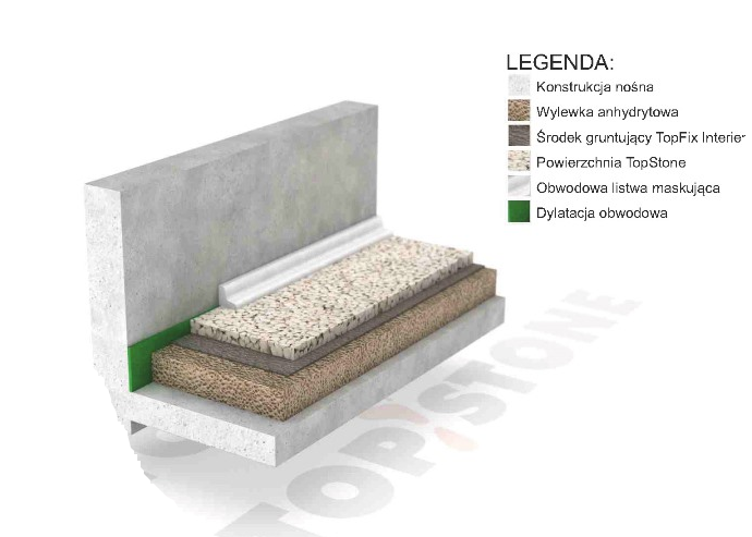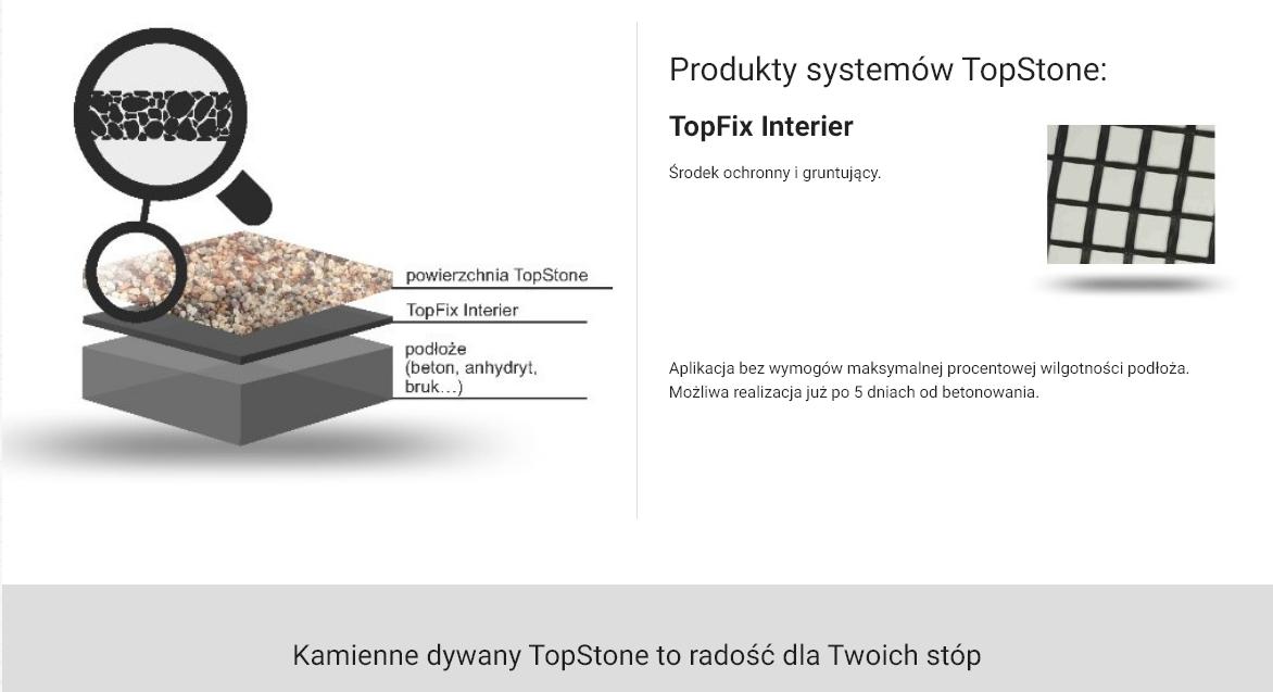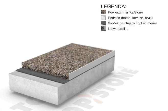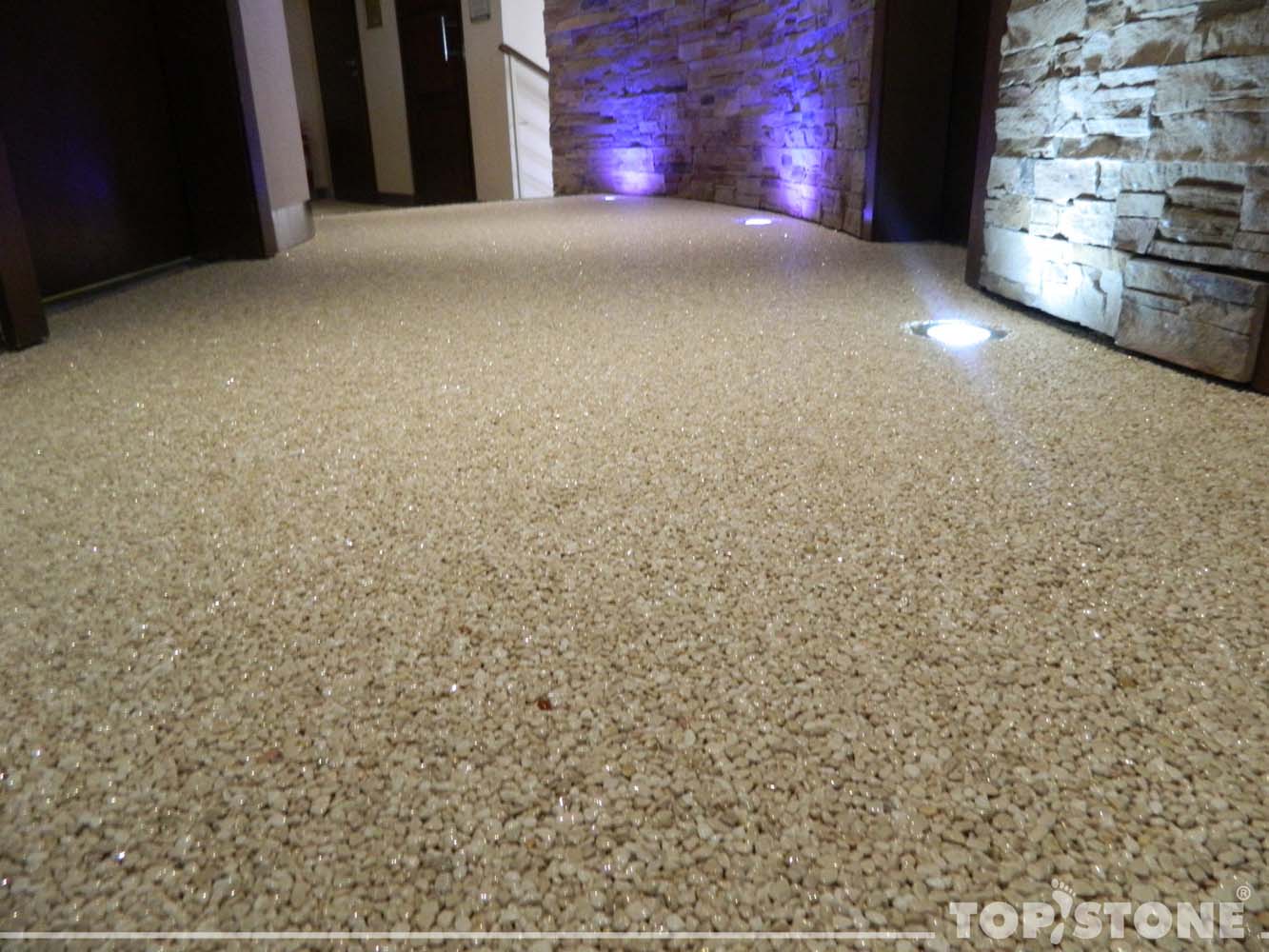 Powierzchnie Dywany Kamienne TopStone można układać również na świeżo położony, niedojrzały beton (5 dni po betonowaniu) oraz anhydryt (do 2% wilgotności resztkowej). Powierzchnia Dywany Kamienne TopStone służy także jako warstwa wyrównująca (podłoże nie musi być idealnie płaskie).