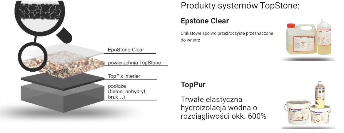 • - Wykonanie podło ża TopStone przy wykorzystaniu spoiwa EpoStone Clear, zalecana minimalna grubość powierzchni wynosi 1,5x krotności największej zawartej frakcji wypełniacza (kamieni)