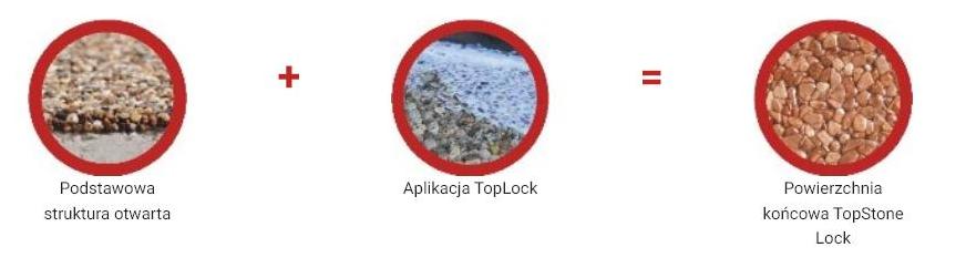 • - Na podstawową strukturę otwartą powierzchni TopStone należy nanieść po ok. 24 godzinach (w zależności od temperatury) materiał TopLock (specjalna masa jednoskładnikowa). Zalecana wielkość frakcji kruszywa powierzchni TopStone wynosi do 5mm, w przypadku większych grubości zużycie materiału TopLock jest większe, dłuższy jest także proces utwardzenia.