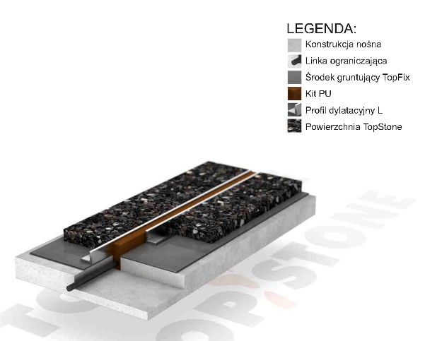 Zastosowanie: dylatację powierzchni Topstone należy wykonać w miejscach dylacji konstrukcyjnych podłoża. Wysokość profili dylatacyjnych określa się na podstawie grubości powierzchni. Zaletą dylatacji jest mniejsza powierzchnia do realizacji bez przerwy technologicznej. w przypadku układania powierzchni TopStone na jednolitym podłożu bez dylacji należy, zwłaszcza w przypadku świeżych ( 5-28 dni od betonowania) betonów, należy wykonać dylację podłoża.