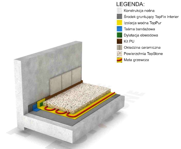 Zastosowanie: umieszczenie maty grzewczej pod powierzchnią TopStone wpływa na doskonałą akumulacje oraz doprowadzenie ciepła do powierzchni i pomieszczenia.
