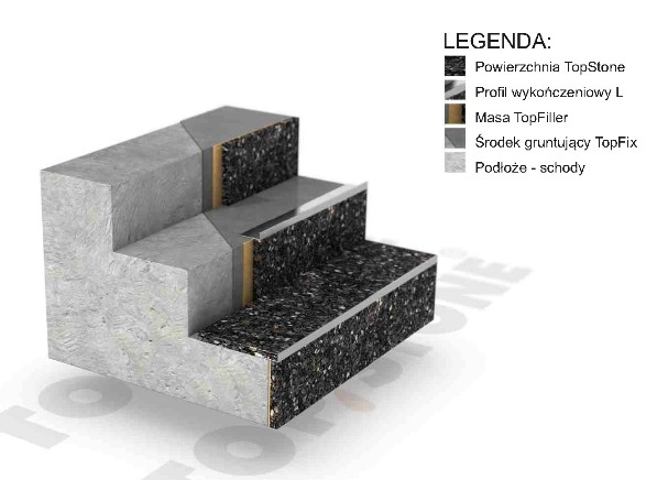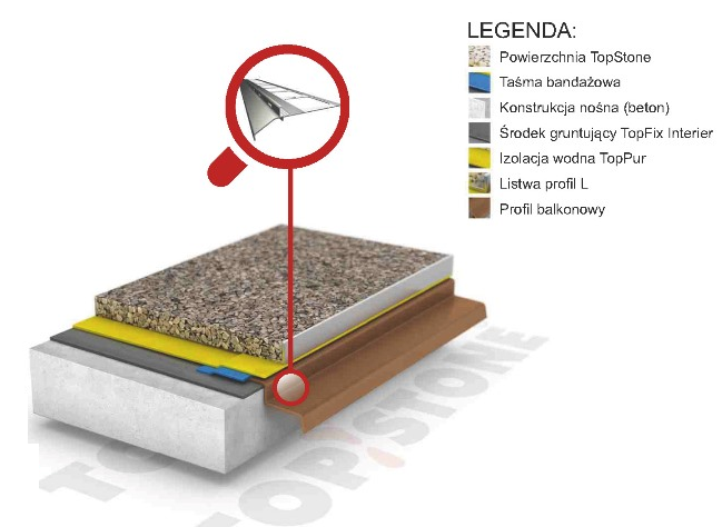 Zastosowanie: balkony, loggie, tarasy wykończenie profilem okapowym ( wyłącznie klejenie punktowe listwy – odprowadzenie wody pod listwą, powierzchnię TopStone można zakończyć również na krawędzi profilu balkonowego w formie pełnego wykończenia zanikającego), lub też wykorzystanie profilu balkonowego z perforacją w przypadku otwartej struktury powierzchni TopStone. Zalety: odprowadzenie wody z krawędzi konstrukcji podkładowej dopasowanie kolorystyczne do powierzchni, szybkie wykonanie . Narożniki i kąty wykonywane są za pomocą elementów uzupełniających